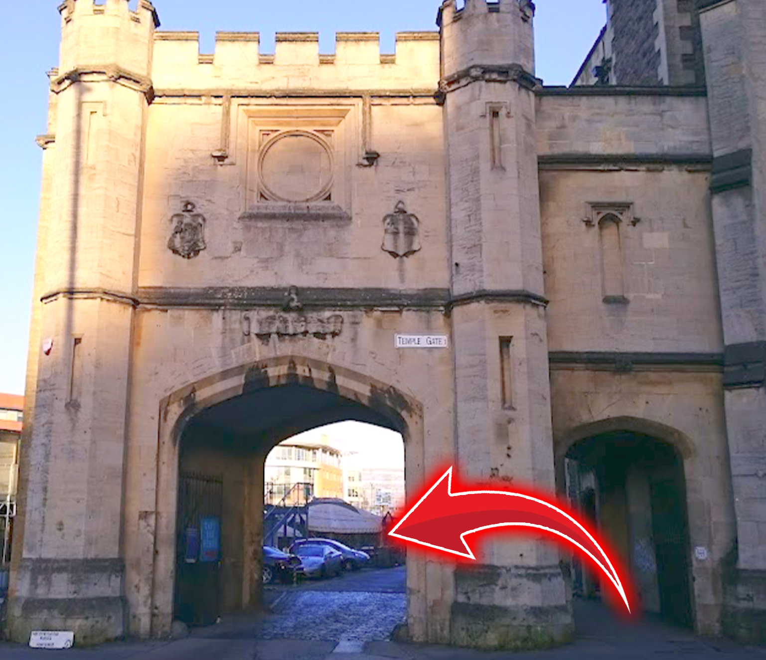After turning right, there is a beautiful stone arch to your right. Walk through the arch.